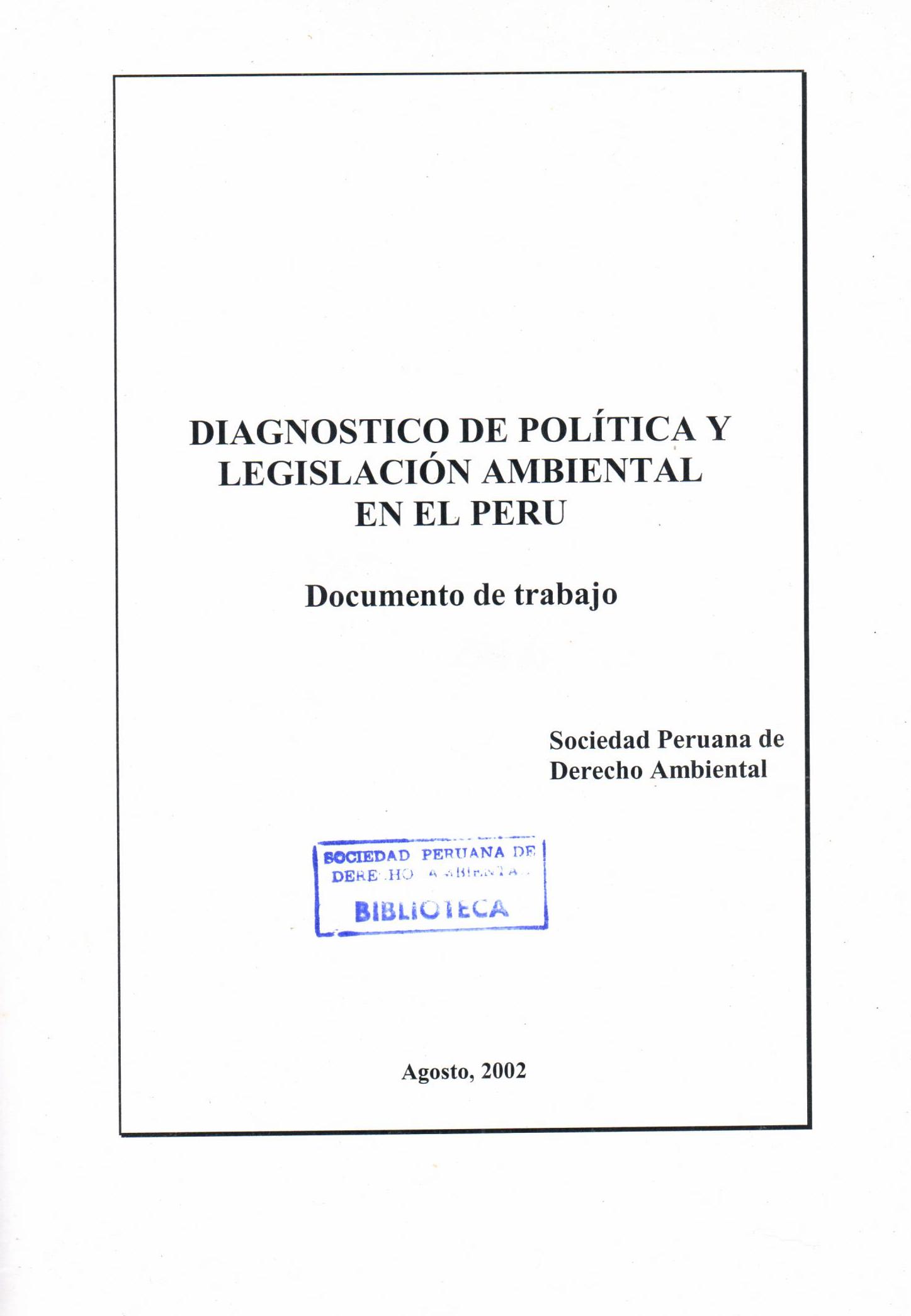 | Sociedad Peruana de Derecho Ambiental. Diagnóstico de política y legislación ambiental en el Perú. --Lima: 2002. # Ingreso:14419 101 tbls., grafs.