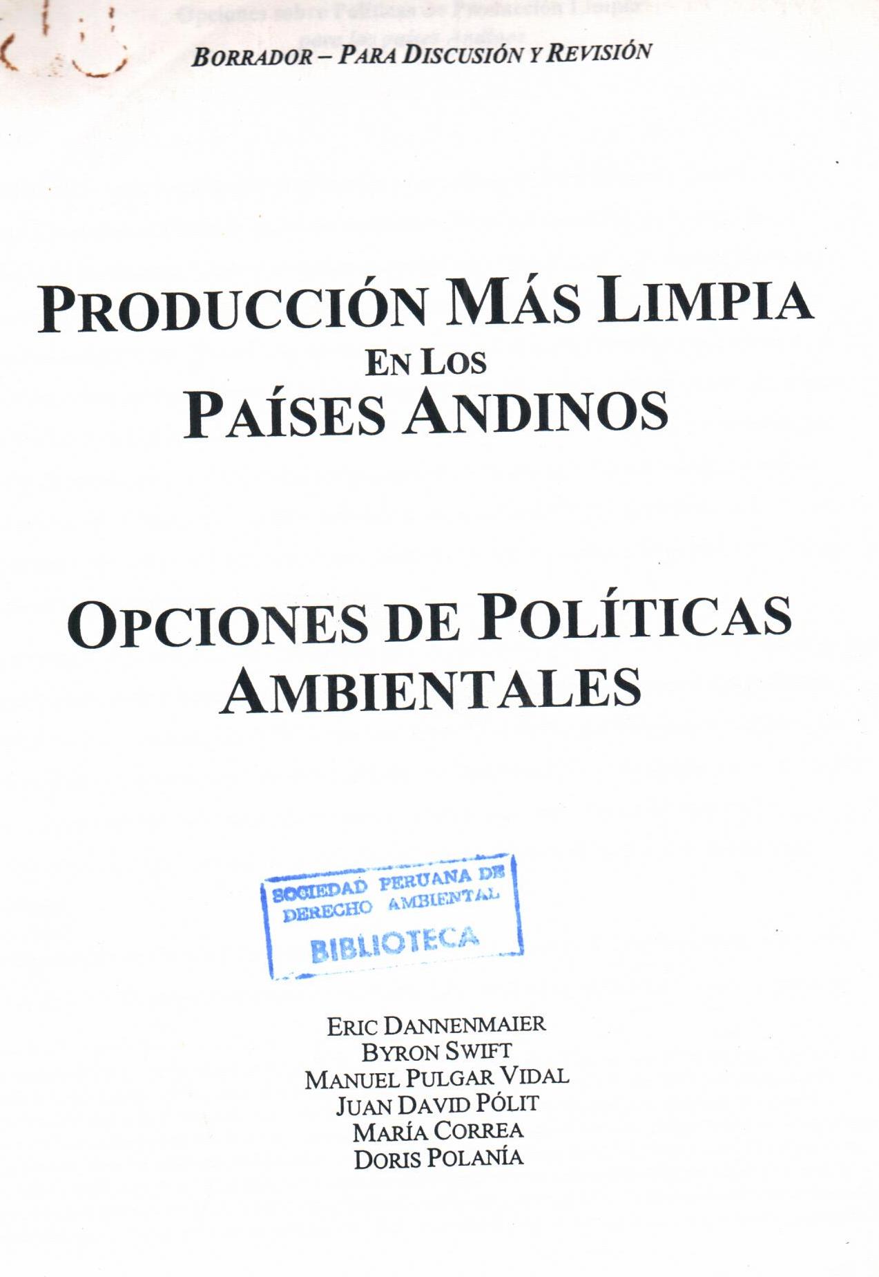 | Dannenmaier, Eric; Swift,Byron; Pulgar-Vidal, Manuel. Producción más limpia en los países andinos: opciones de políticas ambientales. --Lima: # Ingreso:14415