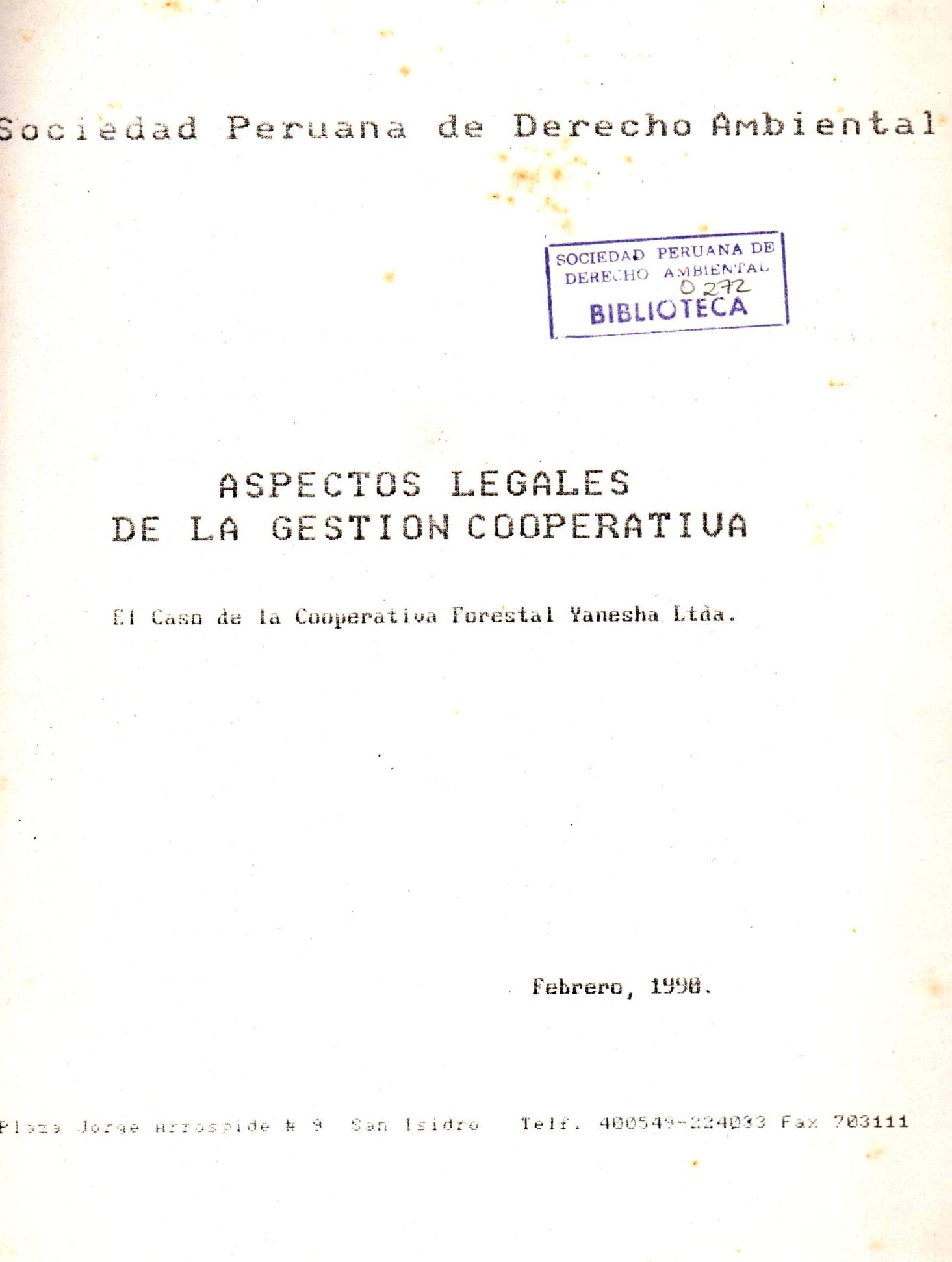 | Sociedad Peruana de Derecho Ambiental. Aspectos legales de la gestión cooperativa: el caso de la Cooperativa Forestal Yanesha Ltda. --Lima: SPDA: 1990. # Ingreso:12188 49 ilus.