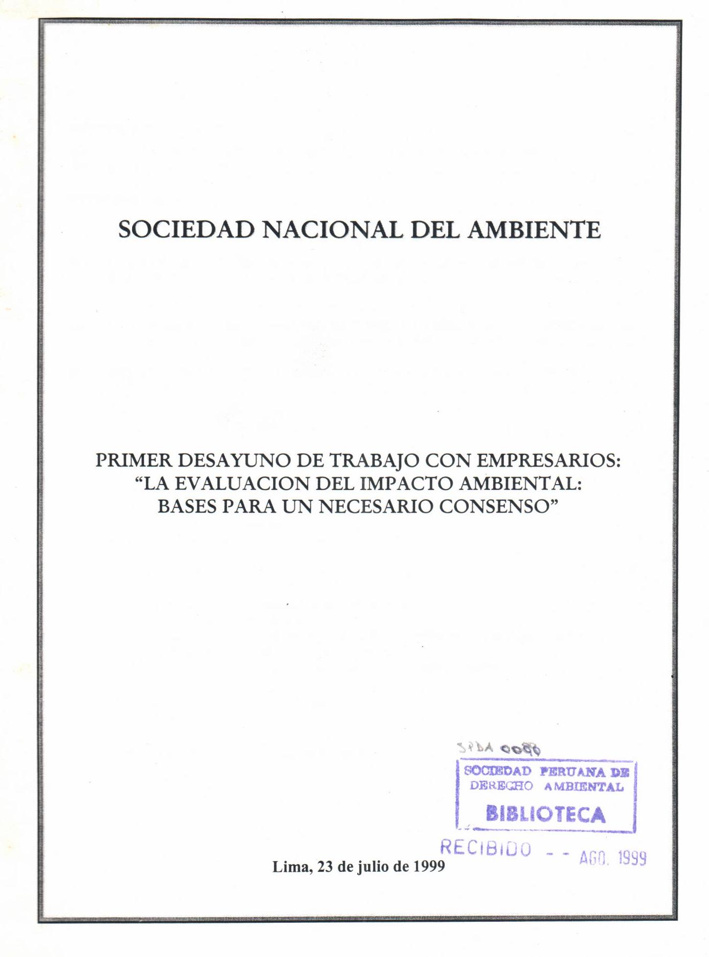 | Sociedad Nacional del Ambiente. Primer desayuno de trabajo con empresarios: La evaluación del impacto ambiental: bases para un necesario consenso. --Lima: 1999. # Ingreso:12160 54