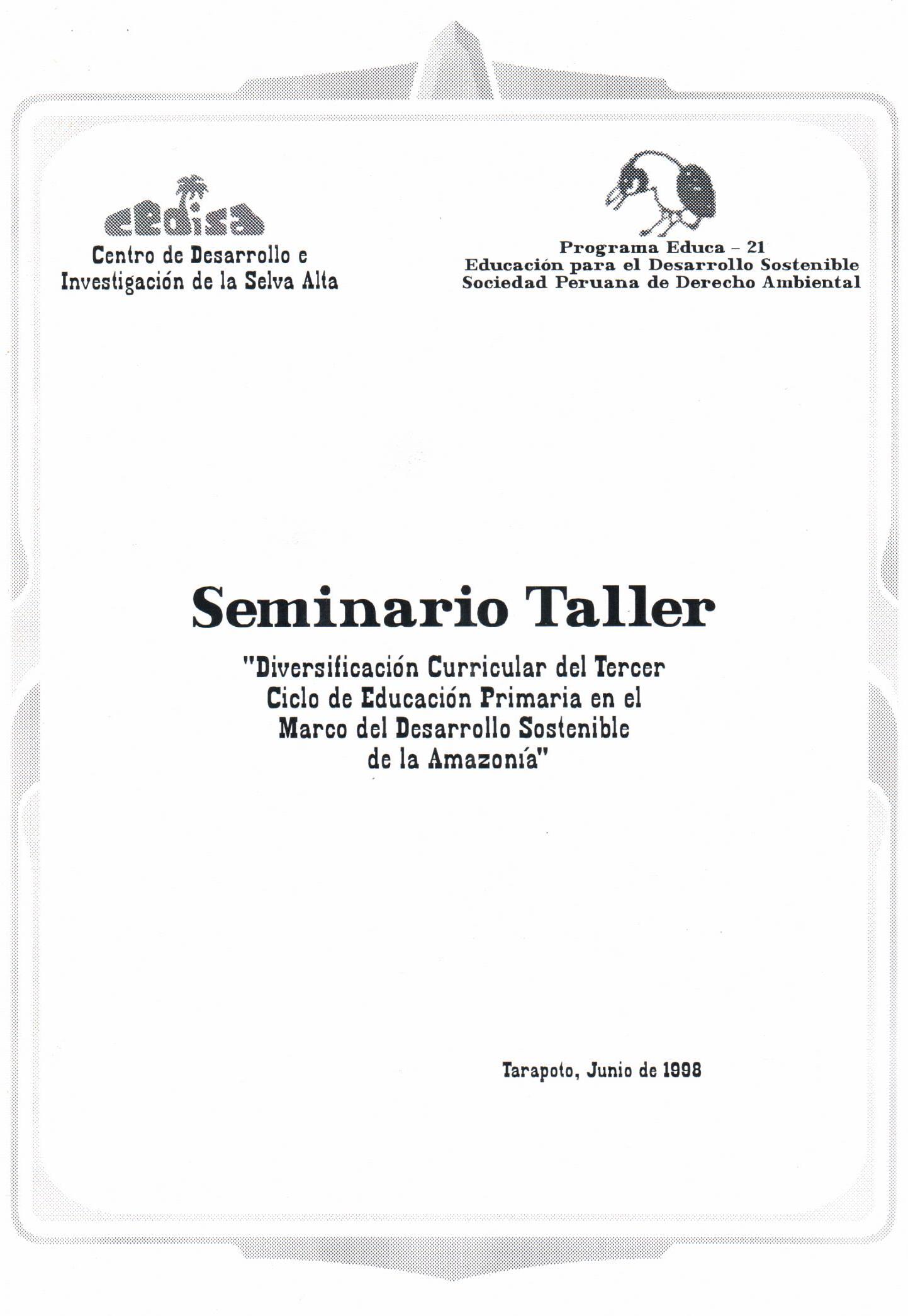 | Sociedad Peruana de Derecho Ambiental; Centro de Desarrollo e Investigación de la Selva Alta. Seminario Taller 'Diversificación curricular del tercer ciclo de e ducación primaria en el marco del desarrollo sostenible de la Amazonia'. --Lima: 1998. # Ingreso:12129 20