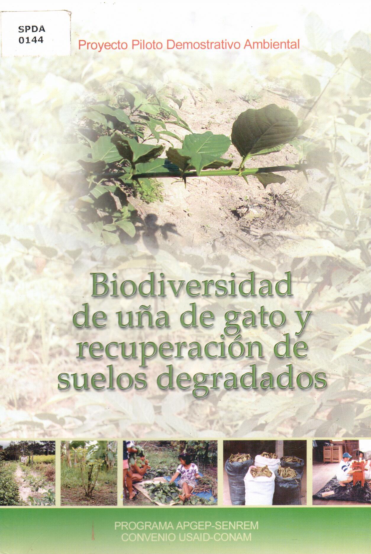 | Sociedad Peruana de Derecho Ambiental; Programa Apgep-Senrem, Convenio USAID-CONAM. Biodiversidad de uña de gato y recuperación de suelos degradados. --Lima: SPDA: 2001. # Ingreso:12120 110 ilus.