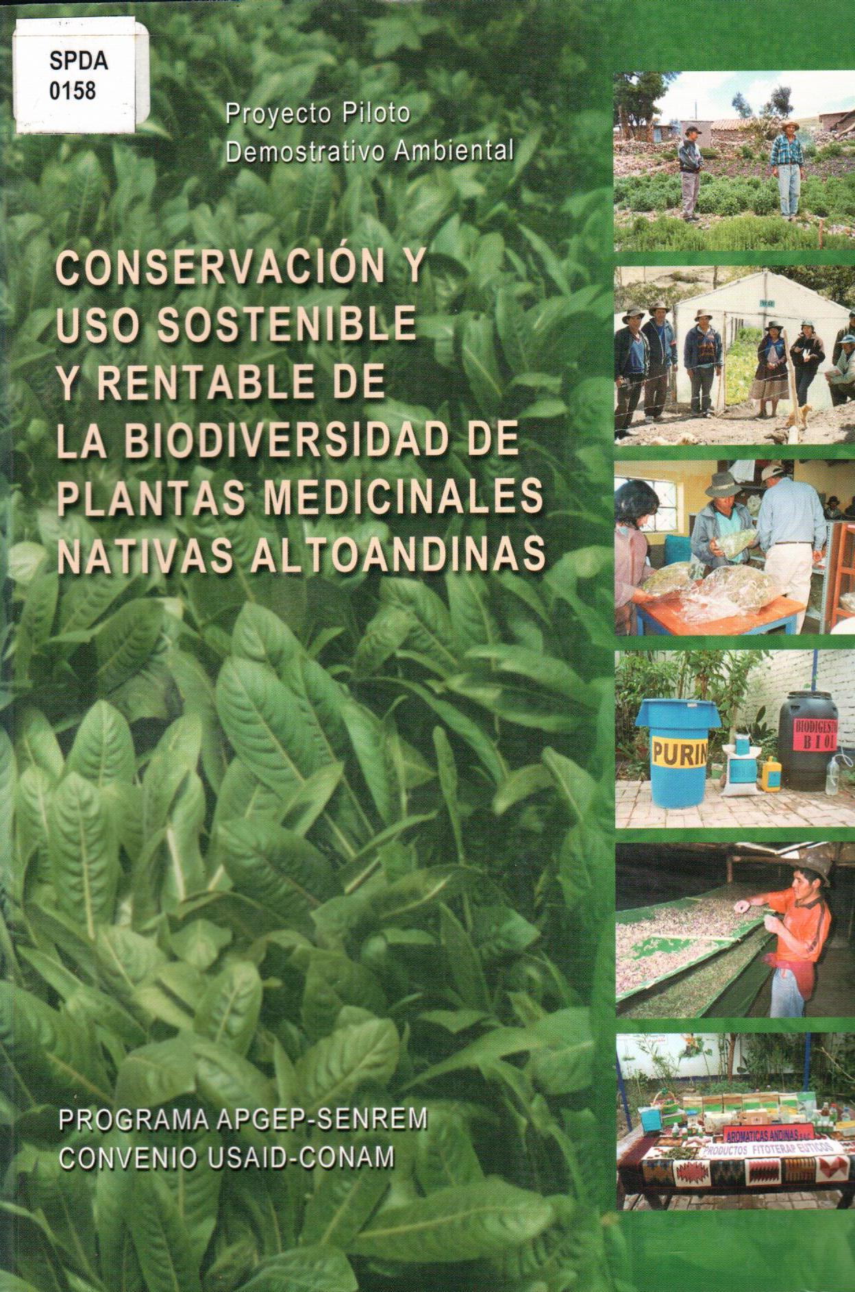 | Sociedad Peruana de Derecho Ambiental; Programa Apgep-Senrem, Convenio USAID-CONAM. Conservación y uso sostenible y rentable de la biodiversidad de plantas medicinales nativas altoandinas, por pisos ecológicos, por la población campesina de Ayacucho. --Cusco: SPDA: 2002. # Ingreso:12109 101 ilus.