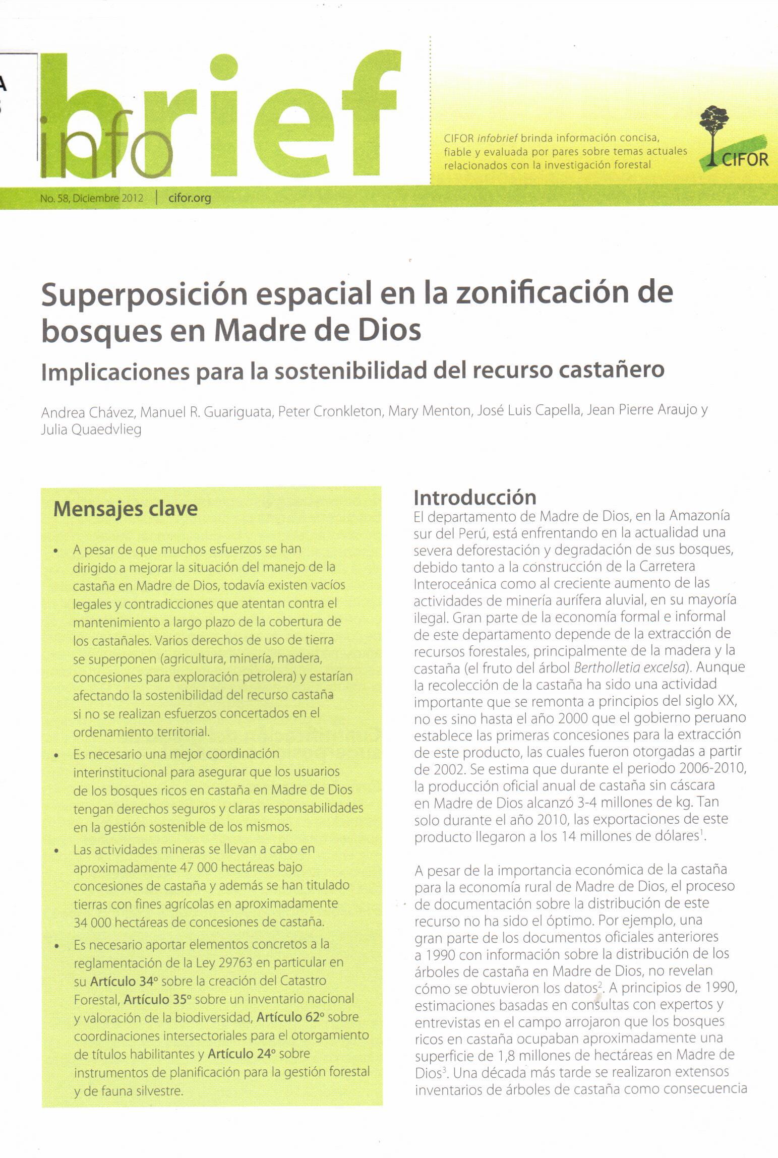| Chávez, Andrea; Guariguata, Manuel R.; Gronkleton, Peter; Menton, Mary; Capella, José Luis; Araujo, Jean Pierre; Quaedvlieg, Julia. Superposición espacial en la zonificación de bosques en Madre de Dios: implicaciones para la sostenibilidad del recurso castañero. --Lima: CIFOR; SPDA: 2012. # Ingreso:12019 8