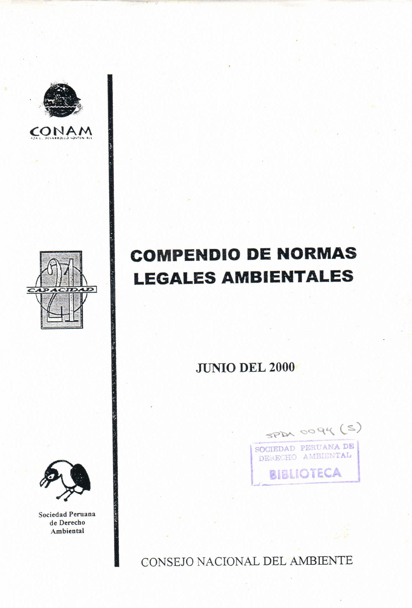 | Sociedad Peruana de Derecho Ambiental; CONAM. Compendio de normas legales ambientales, selección. --Lima: 2000. # Ingreso:11998 457