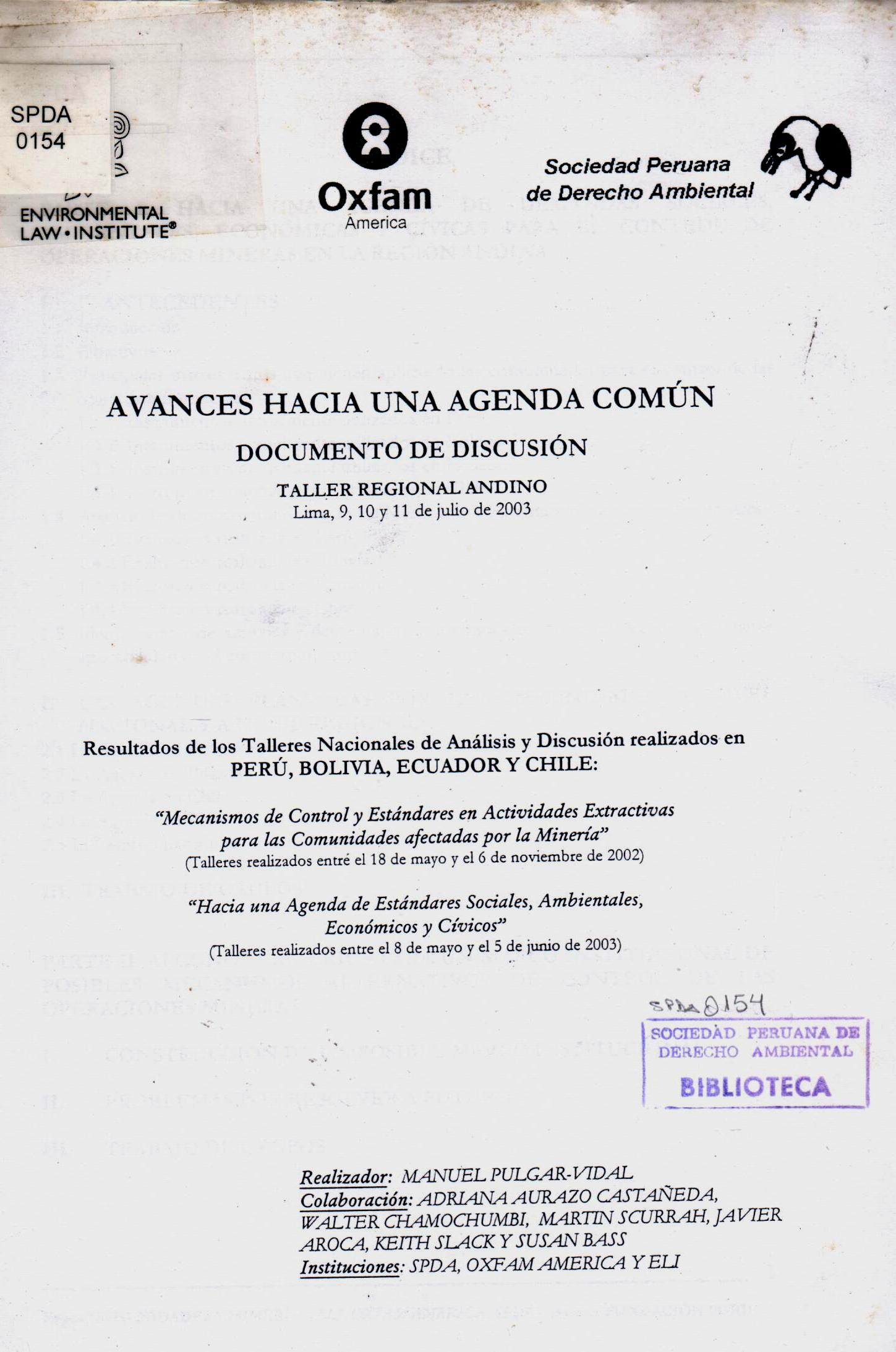 | OXFAM; Sociedad Peruana de Derecho Ambiental; Environmental Law Institute. Avances hacia una agenda común: documentos de discusión. --Lima: SPDA: 2003. # Ingreso:11246 35