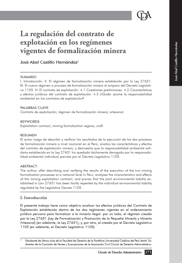 | Castillo Hernández, José Abel. La regulación del contrato de explotación en los regímenes vigentes de formalización minera. --2015. # Ingreso:18972 271-286 pp.