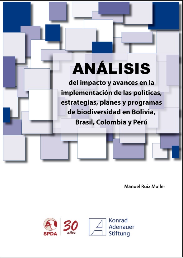 | Ruiz, Manuel. Análisis del impacto y avances en la implementación de las políticas, estrategias, planes y programas de biodiversidad en Bolivia, Brasil, Colombia y Perú. --Lima: SPDA; Konrad Adenauer Stiftung: 2016. # Ingreso:19306 39 pág. Ilus., grafs..