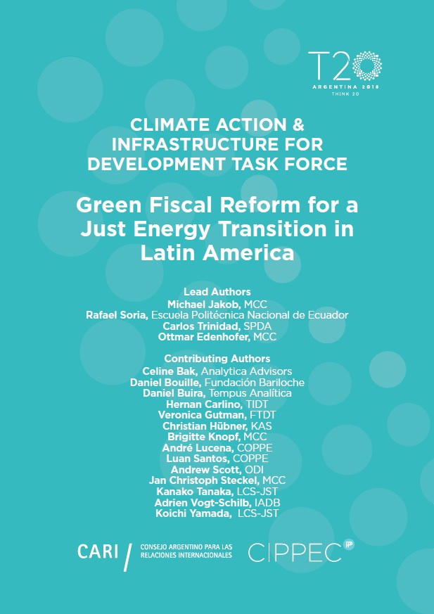 | Jakob, Michael; Soria, Rafael; Trinidad, Carlos. Climate action and infrastructure for development task force: Green fiscal reform for a just energy transition in Latin America. --Buenos Aires: CARI; CIPPEC: 2018. # Ingreso:19502 16 pág.