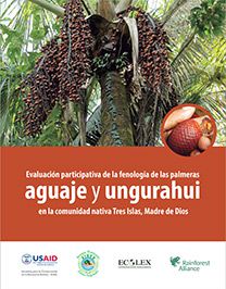 | Díaz Gonzales, Juan; Paredes, Manuel; Martinez, Javier. Evaluación participativa de la fenología de las palmeras aguaje y ungurahui en la comunidad nativa Tres Islas, Madre de Dios. --Lima: Rainforest Alliance, USAID, AIDER, ECOLEX, : 2015. # Ingreso:10577 36 pág. Ilus.; tabls..