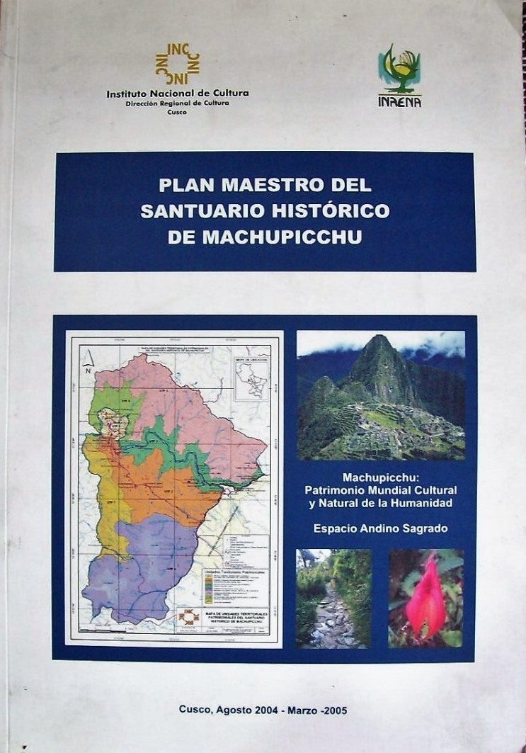 | INRENA. Plan maestro del Santuario Histórico de Machupicchu. --Lima: Instituto Nacional de Cultura: 2005. # Ingreso:10616 234 pág. ilus., gráfs..